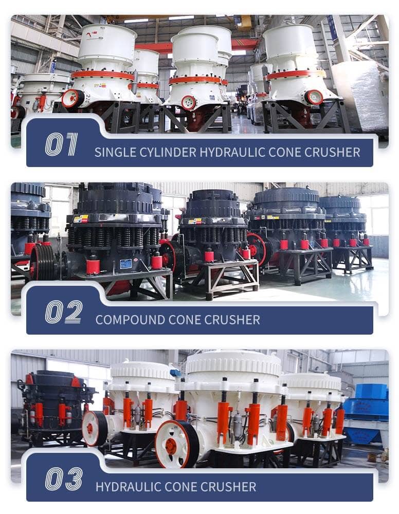 There are different models in HXJQ divided by different crushing principles and different particle sizes: single cylinder hydraulic cone crusher, multi-cylinder hydraulic cone crusher, hydraulic cone crusher, Symons cone crusher (compound cone crusher), and spring cone crusher. At present, the most advanced one is the single cylinder hydraulic cone crusher, and the most popular one is the Symons cone crusher.